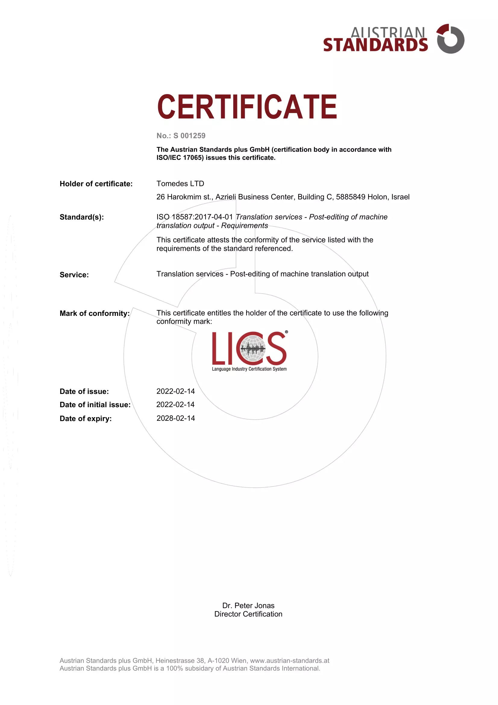 Grazie a questa certificazione ISO, noi di Tomedes possiamo assicurarvi che il nostro lavoro di traduzione automatica è gestito e post-editato da specialisti, consentendovi di trarne vantaggio senza compromettere la qualità.